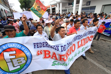 Los gremiales de Santa Cruz, La Paz y Cochabamba salieron a las calles en una marcha pacífica en contra de la Ley que modifica el Código Tributario, ellos indican que atenta contra su economía y su derecho al trabajo. En la capital cruceña los comerciantes de la feria Barrio Lindo, La Ramada, Los Pozos, Abasto, hasta los dueños de billares y rockolas, tomaron el centro de la ciudad donde instalaron una vigilia desde la calle Ingavi en las instalaciones del Servicio de Impuestos Nacionales (SIN) hasta la plaza 24 de Septiembre.